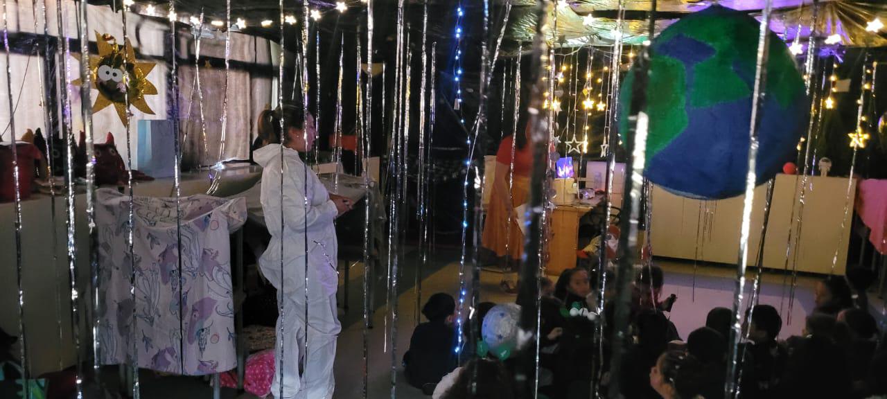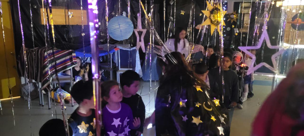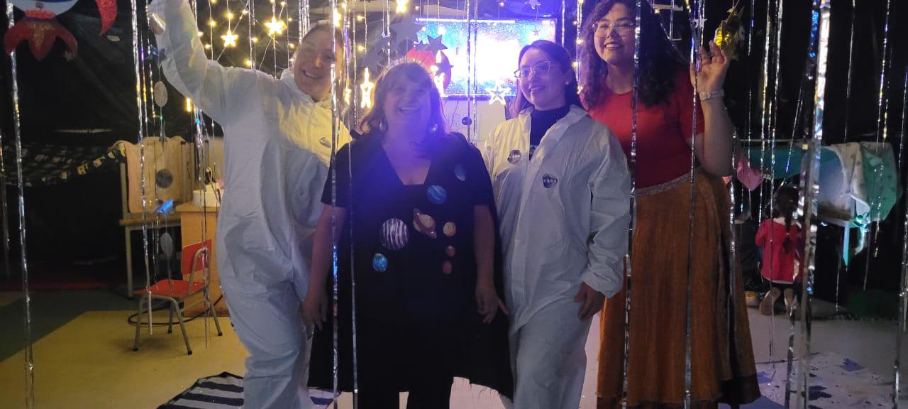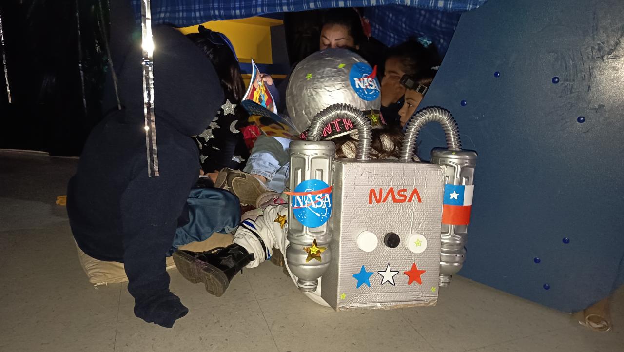 “El objetivo principal era fomentar la lectura de una forma más lúdica e incorporando a la familia”, explicó Nataly Céspedes, educadora de párvulo, quien detalló que la sala fue ambientada previamente y que apoderados prepararon materiales y luces para generar una experiencia distinta de lectura. Los niños y niñas se caracterizaron como astronautas o marcianos, mientras sus familias leían cuentos en carpas y luego iban cambiando de ‘bases espaciales’.